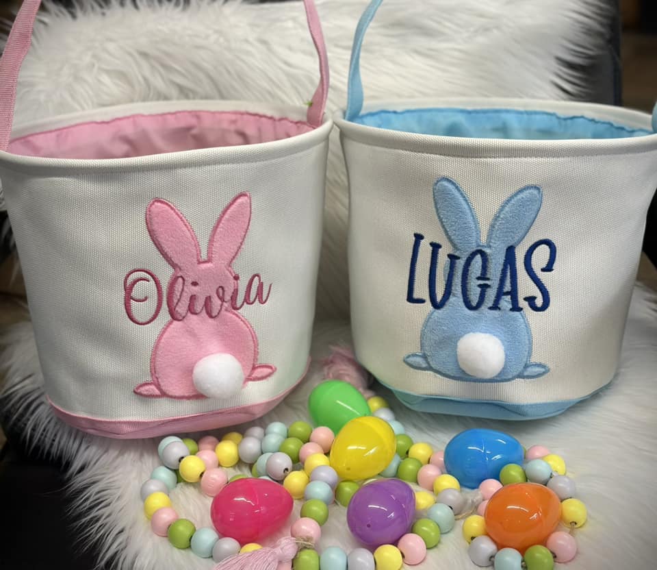 Make this Easter extra special with our personalized Easter baskets featuring adorable bunny designs. Each basket is customized with an embroidered name, adding a unique touch to your Easter celebrations. Perfect for filling with treats and gifts, these baskets are a must-have for Easter egg hunts and family gatherings. Order yours today as supplies are limited.